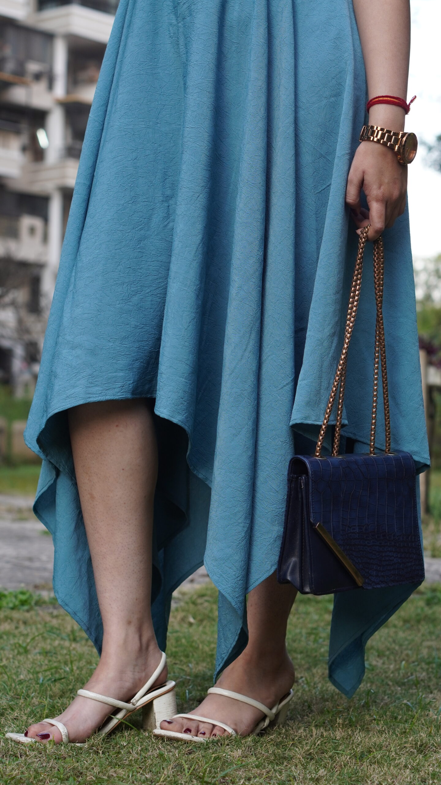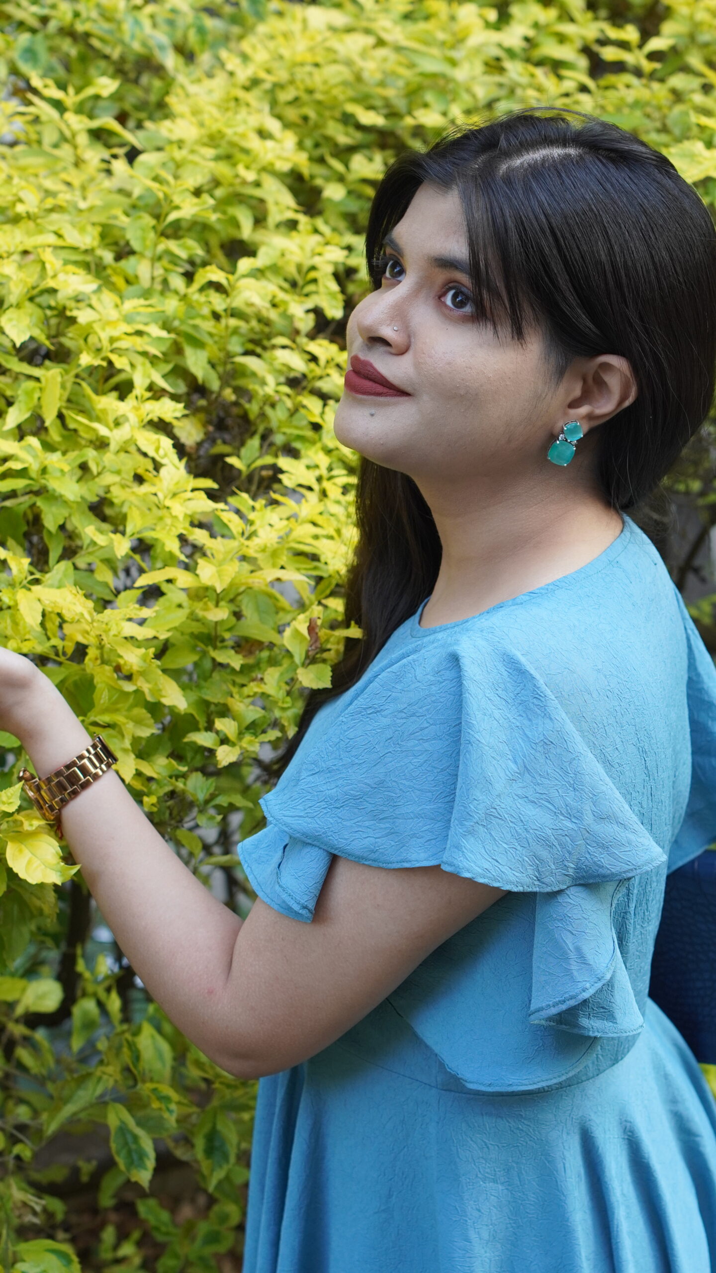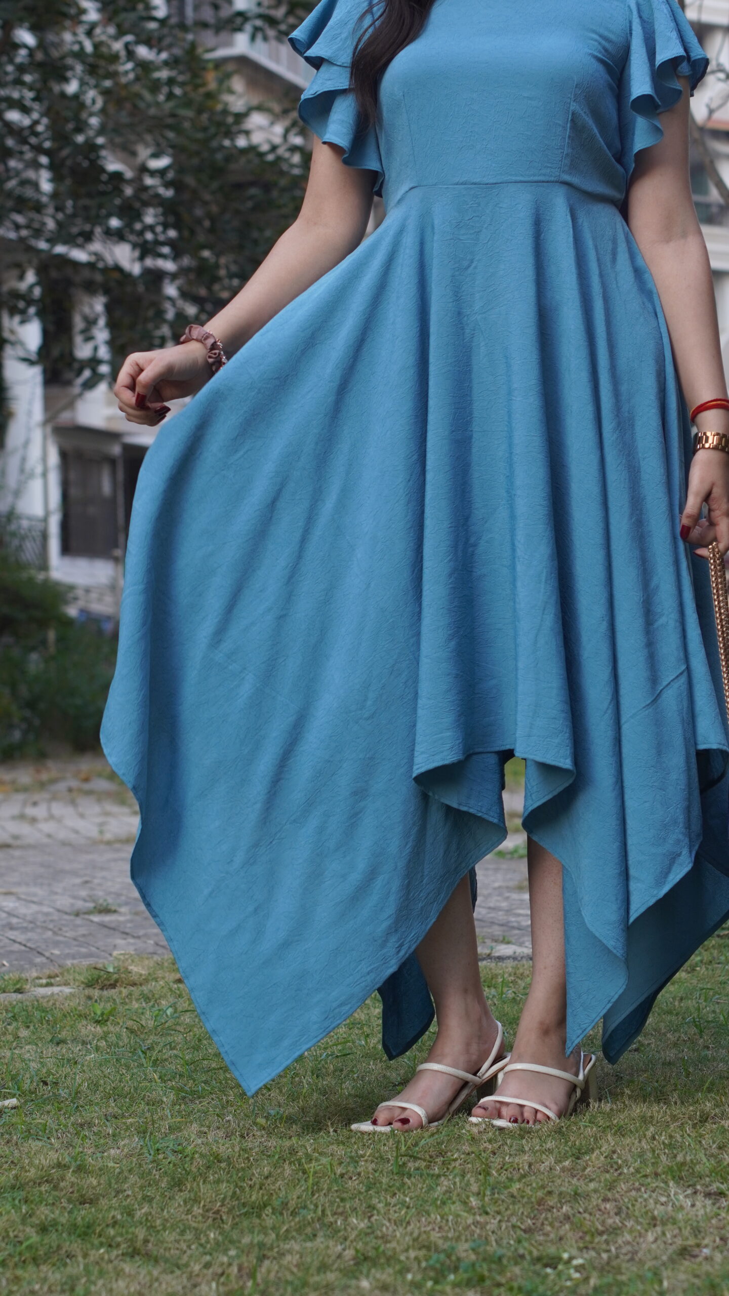 Elevate your everyday look with this sky-blue dress featuring flutter sleeves and an asymmetric flare hemline. Crafted in premium natural crepe, it offers a soft drape and all-day comfort.