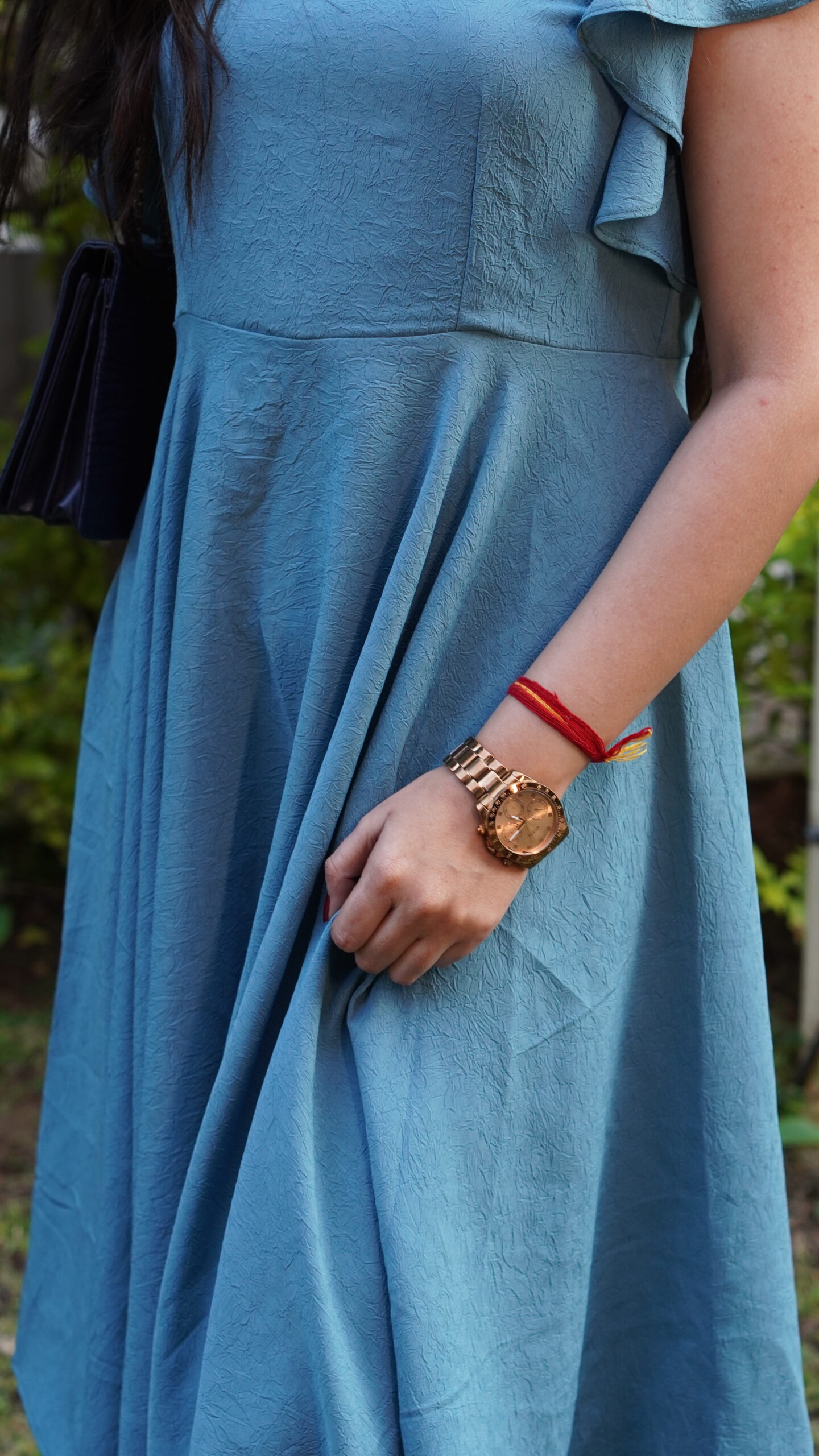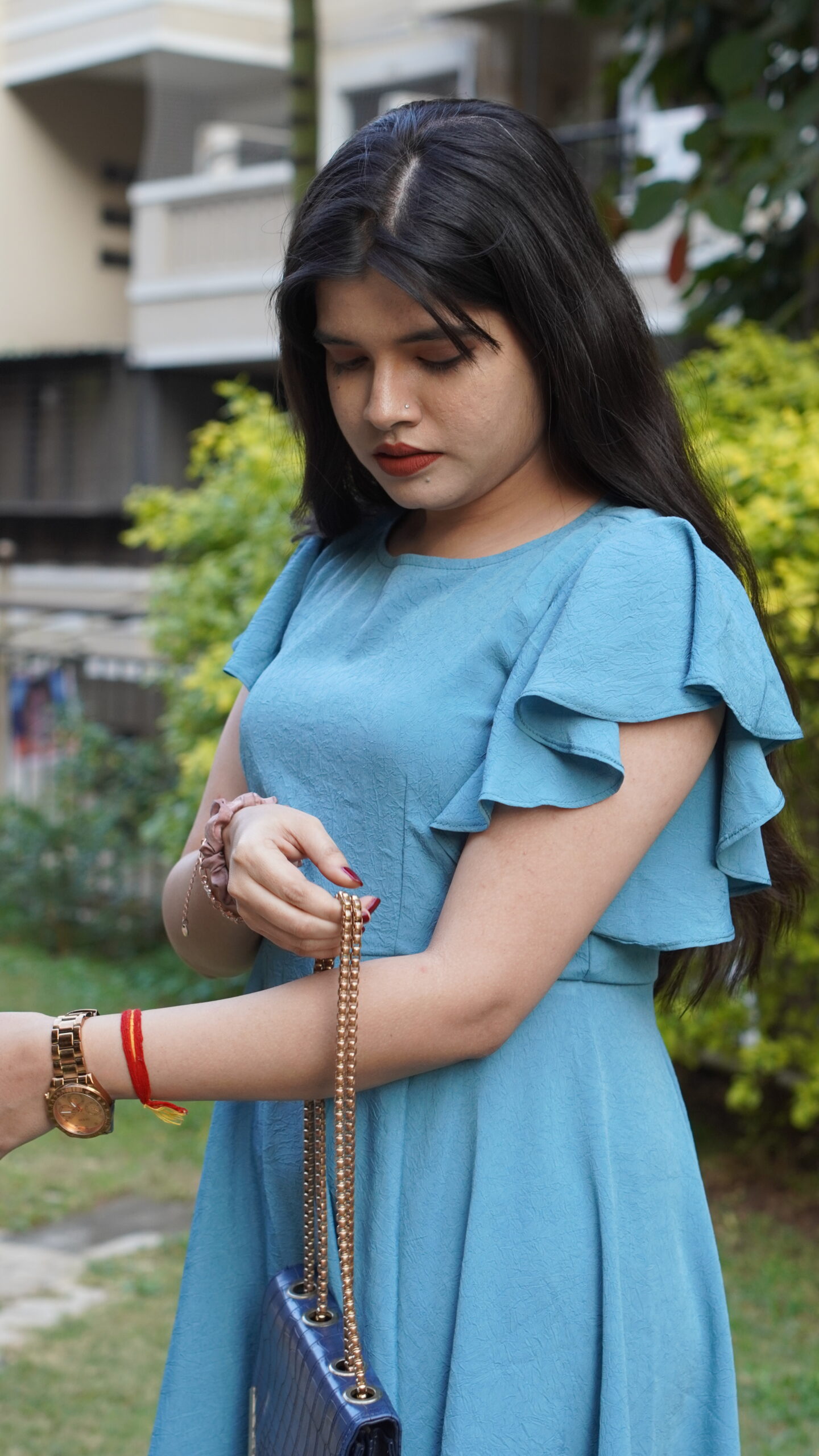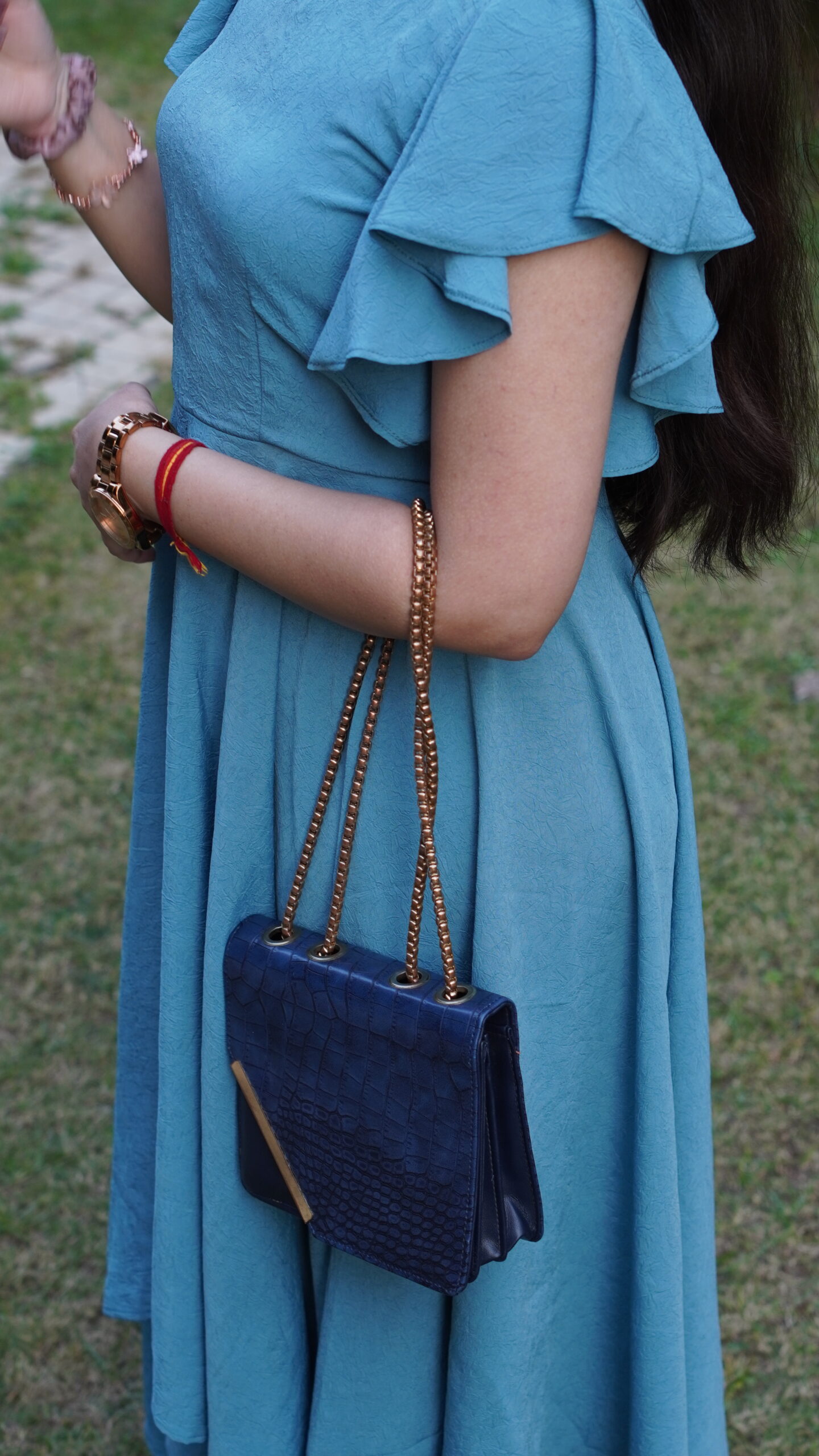 Elevate your everyday look with this sky-blue dress featuring flutter sleeves and an asymmetric flare hemline. Crafted in premium natural crepe, it offers a soft drape and all-day comfort.