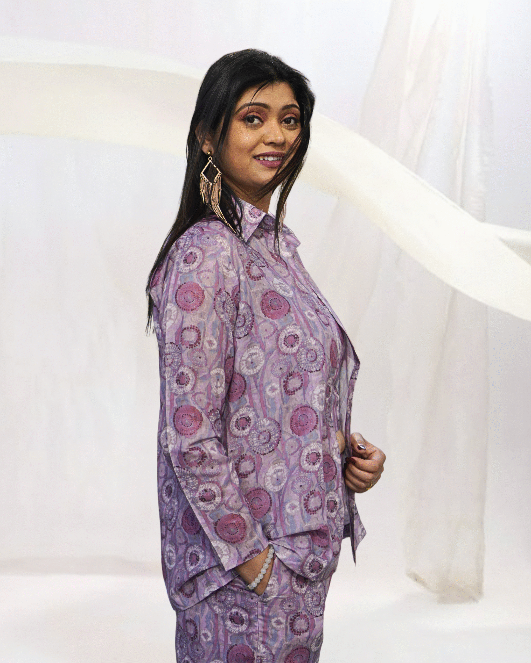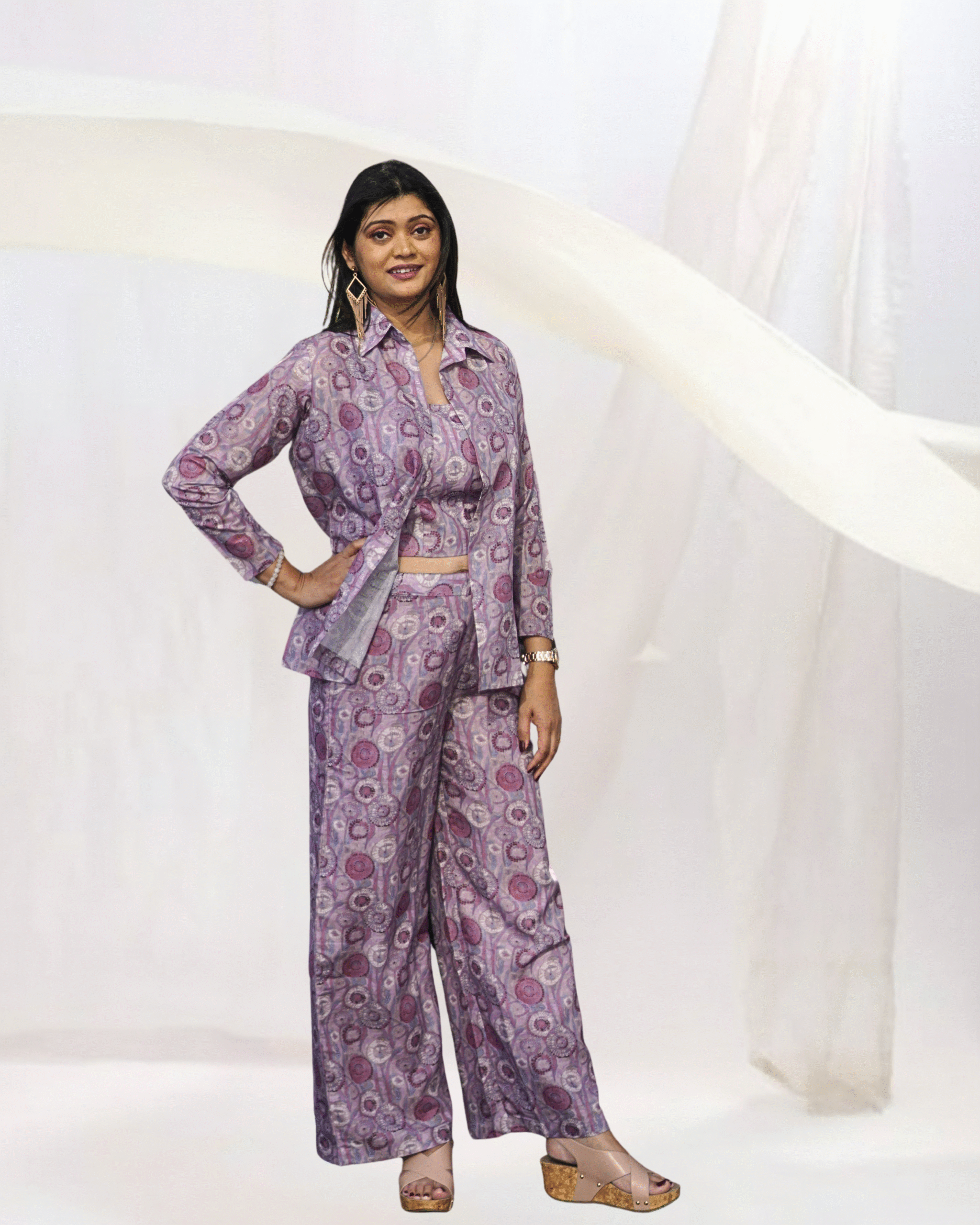 Make a statement with this Lavender Bloom Co-ord Set, crafted from premium cotton fabric with crepe lining for all-day comfort. This stylish 3-piece set includes a printed crop top, wide-leg trousers, and a breezy open shirt. Perfect for brunch dates, casual outings, vacations, and chic day events, this co-ord set blends comfort with a trendy edge.