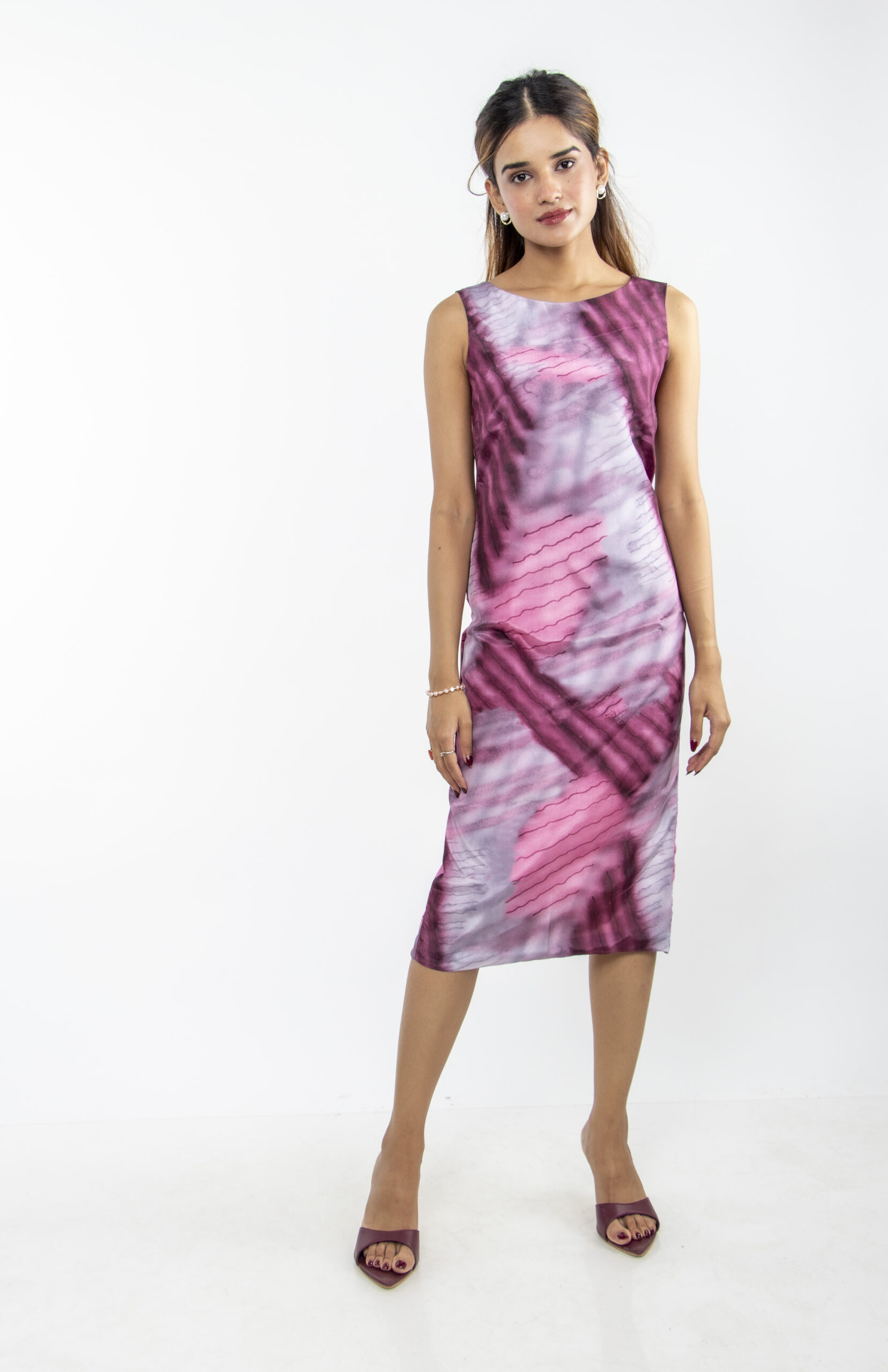 Turn heads with this pink & purple abstract printed midi dress, crafted in premium crepe fabric with smooth lining for a sleek and comfortable finish. Designed in a sleeveless straight silhouette, it drapes beautifully on the body while offering all-day ease. A perfect choice for cocktail parties, evening outings, or festive occasions.